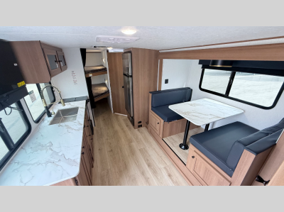 As you step into this trailer, you're welcomed by a private front bedroom featuring a comfortable queen bed, perfect for a restful night's sleep, in between dual wardrobes to neatly store your clothes and essentials. Moving to the center of the space, the dinette nestled in the slide-out offers a cozy spot to dine, gather, or convert into an extra-sleeping area if needed. Just beside it, the 10-cu. ft. refrigerator provides ample space to keep your groceries fresh. Opposite the dinette, the fully equipped kitchen makes cooking on the road a breeze, complete with a stainless-steel sink with a flush-mount cover, an air fryer microwave, and a two-burner cooktop. Toward the rear, you’ll find 48" x 74" double bed bunks, with the lower bunk able to flip up for added flexibility, perfect for accommodating the whole crew. Adjacent to the bunks, a full bathroom adds extra convenience, eliminating the need to rely on campground facilities.