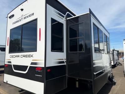 With any Cedar Creek fifth wheel by Forest River, you will find a quality-built RV with your comfort in mind! The all-aluminum super structure on 16" centers or less will provide a solid foundation to your fifth wheel, and the 3M bonded sidewalls will hold up and provide resistance to UV, heat, cold moisture, and even highway chemicals. Each model also includes a Road Warrior suspension for smooth towing, a 6-Point Hydraulic, GEN 3 Leveling System, and a new 101" wide body frame. Inside, you'll enjoy walnut/two tone wooden cabinetry with hidden hinges, cutting board drawer with cut-out trash funnel, motion lighting in the bath and bedroom closet, plus many more comforts. The New Travelfi™ Pay-as-you go internet provides the ability to bring your own internet rather than relying solely on campground WiFi, and the "Rich Solar" 200W solar panel will give you off-grid capabilities!
