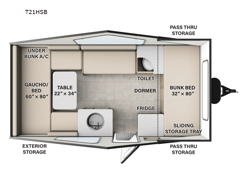 Take this lightweight A-frame to your favorite campground for hassle-free camping! Once you arrive, you can unload the pass-thru storage and additional exterior storage, then head inside to make turkey sandwiches for lunch. There is a 12V refrigerator with a 125W solar panel to keep your items fresh, and a round kitchen sink lets you clean up after lunch. The rear U-shaped seating includes a gaucho bed with side seats and a table, and this space can convert to a 60" x 80" sleeping space. You'll find additional sleeping space on the front 32" x 80" bunk, and don't overlook the convenient toilet for nighttime restroom breaks!