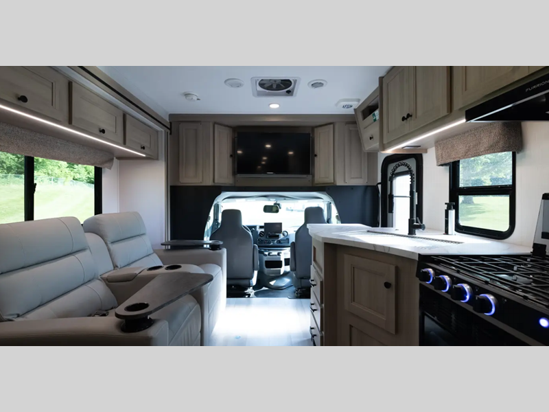 Each model includes an EZ Ryde upgraded suspension system for a smooth drive each time, plus a 10" touch screen and backup camera/side view cameras with a 3-way monitor for easy maneuvering at the campground. The 2" aluminum framed laminated sidewalls and SuperLite composite substrate provide a strong motorhome made to last, and the block foam insulation means you can camp year around. Head inside to find black out roller shades, soft touch self-closing drawer guides, an oxygen-infused shower head, plus a 12V USB charging station to keep your electronics charged and ready to go.