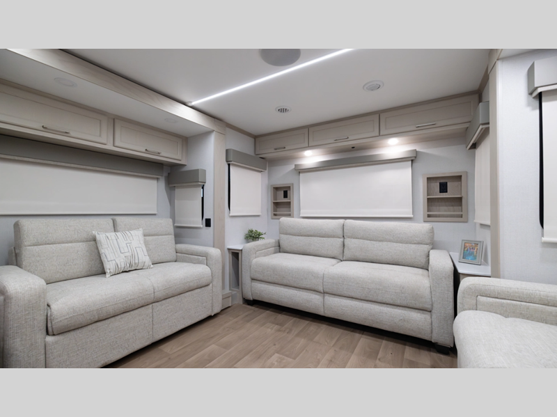 Setting up is simple with the standard 6-point hydraulic leveling system, getting you settled in no time, and the slam latches on all storage doors paired with magnetic compartment holds make accessing your gear effortless. Outside, you'll also find a heated utility convenience center, 12V heat pads on all holding tanks for extended season camping, plus power awnings with LED lights. Inside, you are greeted with upgraded true solid surface countertops in both the kitchen and bath, soft close hidden-hinge reinforced doors and drawers with upgraded hardware, and dimmable ceiling strip lighting with three independent zones to set the perfect mood.
