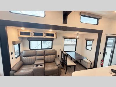 Wherever your destination may be, you can be sure to enjoy it to the fullest with this trailer in tow! With two entry doors, you can enter in through the rear private bedroom or the main living area. The bedroom includes a king bed slide out, a wardrobe/closet to keep your clothes organized, plus a closet with washer and dryer prep. Just outside this room are steps that lead to the large loft area with a 58" x 58" bunk mat and a cabinet on one side, plus two 32" x 69" bunk mats on the other. There is also a cabinet and a wardrobe/closet for plenty of storage space. Once you've headed back downstairs, you can relax on the theater seating, front sofa, or table and chairs with a bench seating. And the chef of your group will love the kitchen with its residential style refrigerator and pantry, kitchen island, and four burner cooktop!
