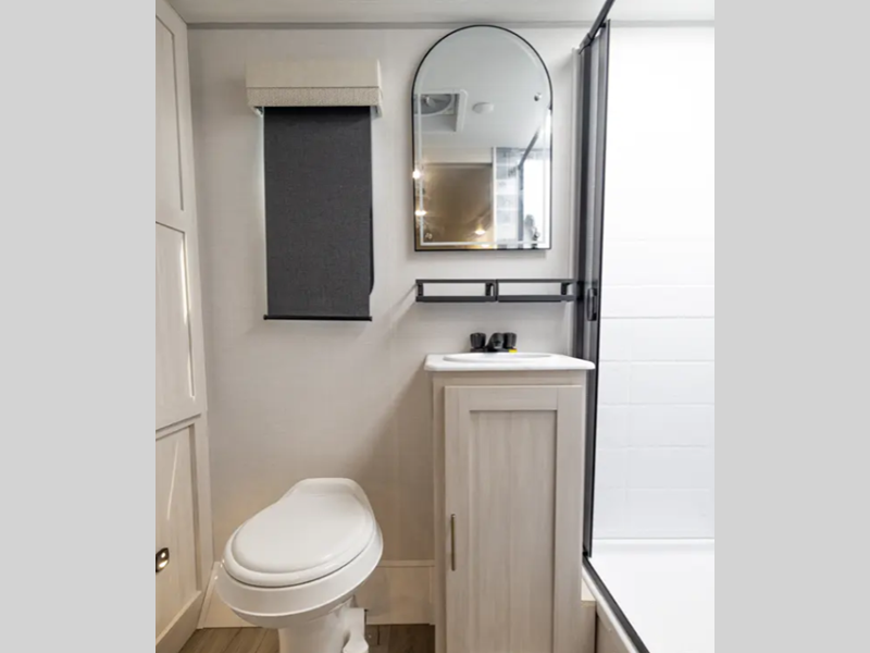 Each one is built with a sealed underbelly with forced heat for added protection against the elements, plus a curved dual-pane acrylic front window with a bug screen and night shade for great outdoor views and natural lighting. You will also find seamless Surf-X kitchen countertops, a central vacuum system, blackout roller shades throughout, and many more comforts.