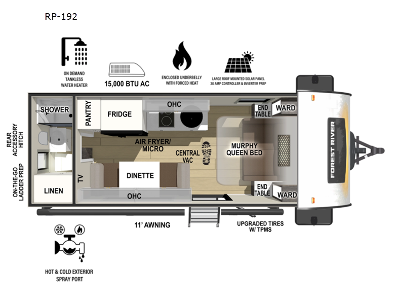 With any R-Pod travel trailer by Forest River, you will enjoy affordable luxury at the lowest tow weight in its class! There is a sealed underbelly with forced heat, a curved dual-pane acrylic front window with a bug screen and night shade, plus a large roof mounted solar panel for off-grid capabilities. The 15K A/C unit will keep you comfortable during the summer camping months, and the tankless water heater will provide endless hot showers after hiking, biking, swimming and more! Each model also includes a black glass friction hinge entrance door, roof ladder prep, exterior motion lighting, plus a hot and cold exterior spray port to wash off sand from the beach. Inside, you'll enjoy seamless Surf-X kitchen countertops, blackout roller shades, and a central vacuum system for hassle-free cleaning!