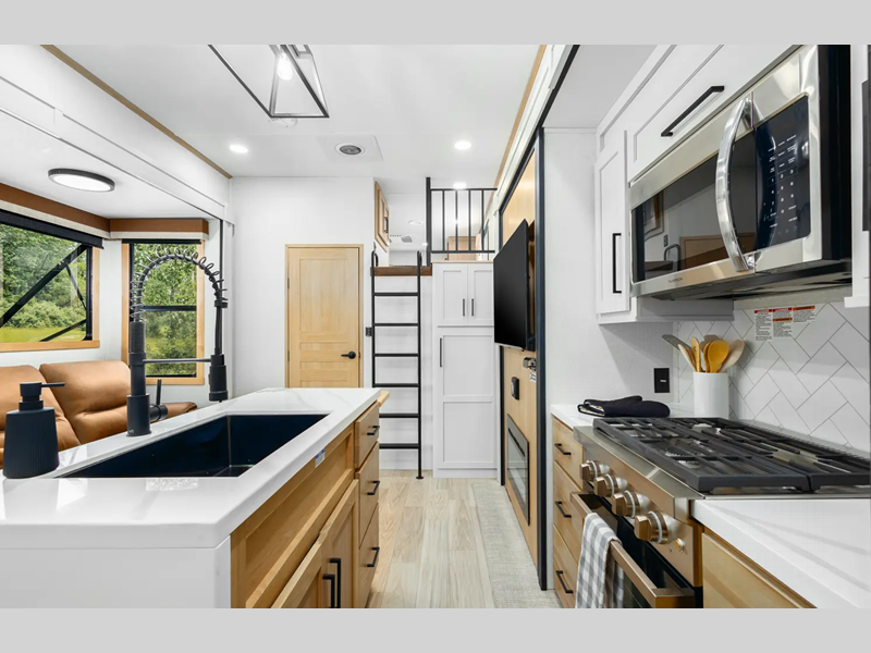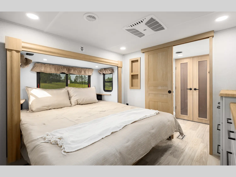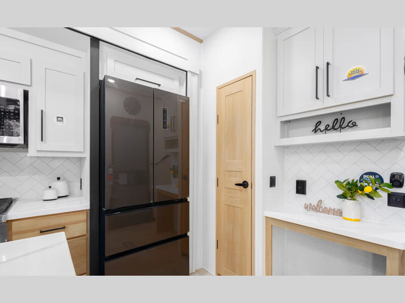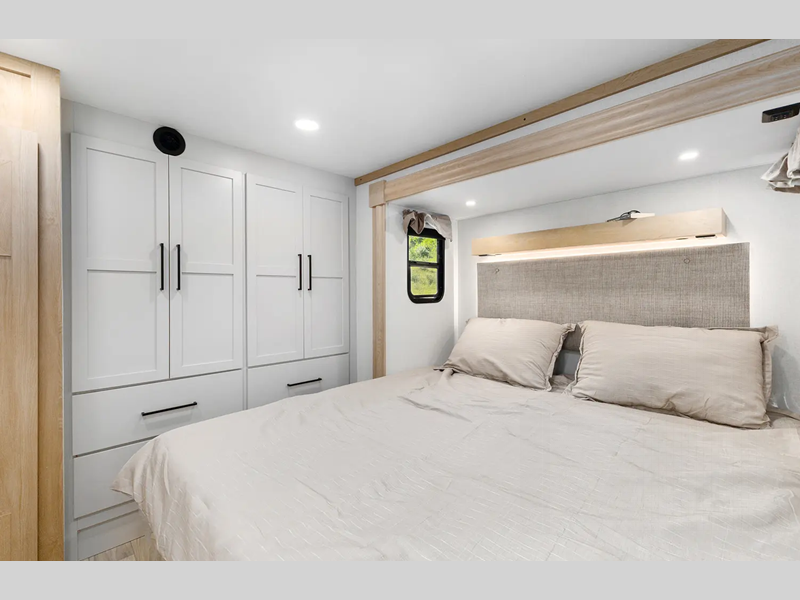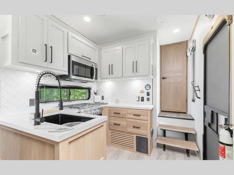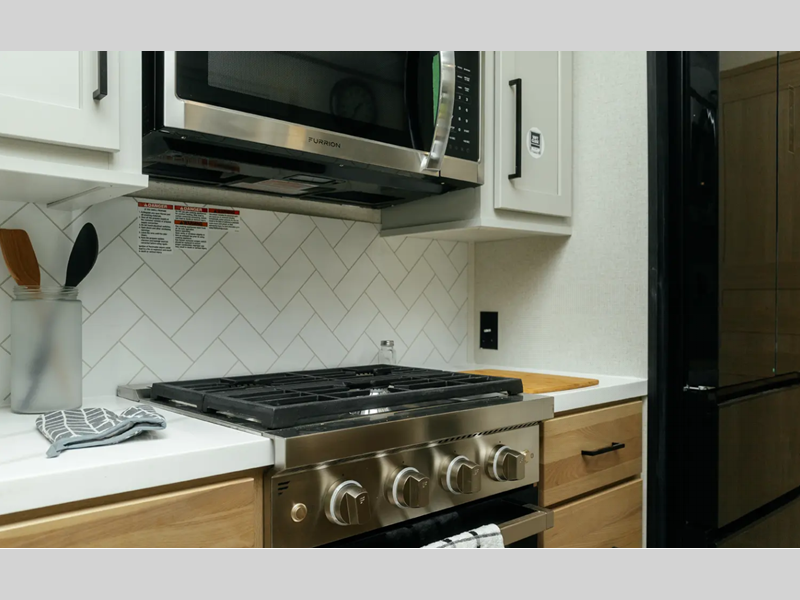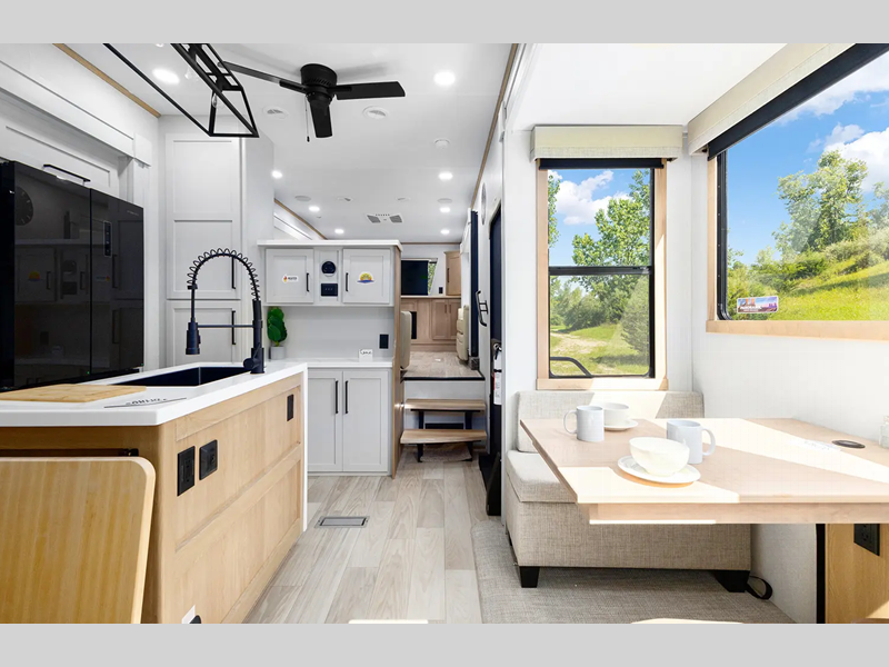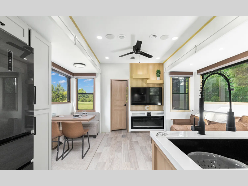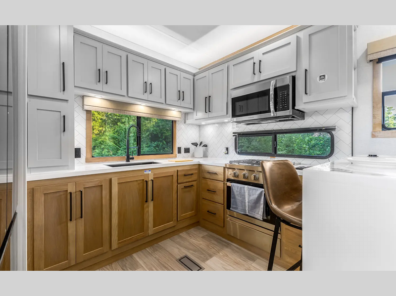 The electric leveling system included makes setting up a breeze allowing you to start having fun sooner. The underbelly armor will protect your unit's vitals from road debris and the painted two-tone aerodynamic fiberglass front cap with improved turning radius will make it easier to maneuver. You'll also enjoy Rich Solar 200W roof mounted solar panel with controller and battery, an on demand tankless water heater, two 15,000 BTU A/C units, and more amenities to make camping hassle-free. And the cook in your group will love the Chef collection 3 burner over with drawer, complete with solid surface countertops, decorative backsplash, and a spacious 12V refrigerator to name a few features.