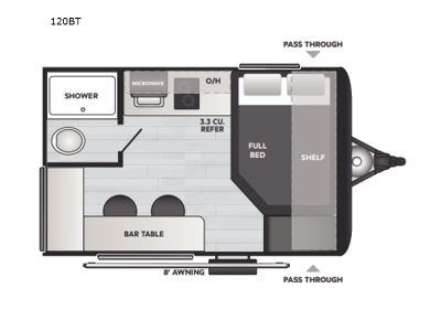 Your small crew will love camping in this lightweight travel trailer. There is a full-size bed up front with an overhead shelf to keep belongings out of the way. The two-burner cooktop and microwave oven will let you make breakfast in the morning, and the bar table with two stools provides a place to dine together. And a private bath with a shower and toilet lets you easily clean up after a day outdoors!