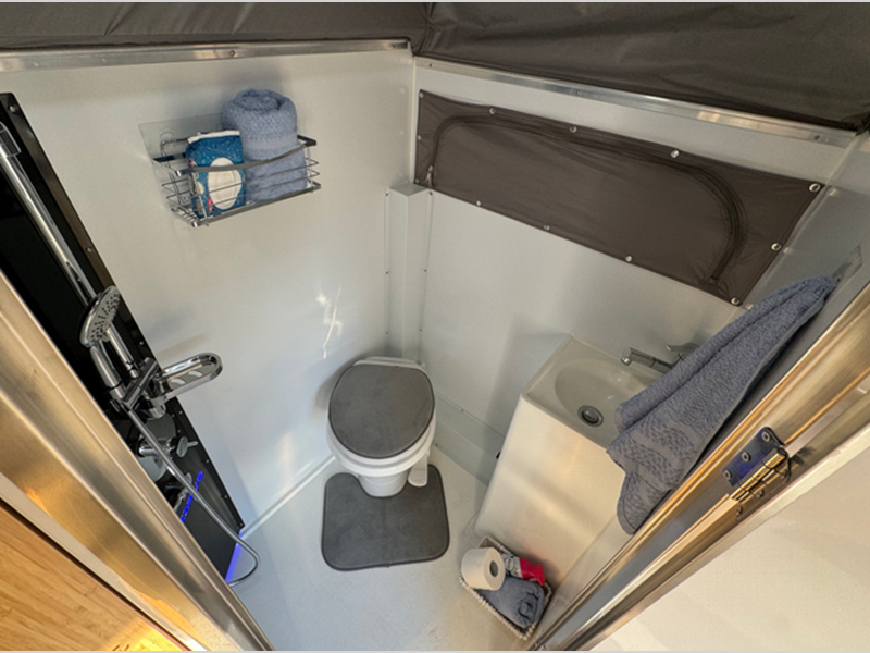 - Indoor Bathroom – Shower, Toilet, Mirror, Sink and Retractable Faucet