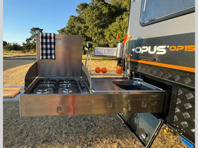 - 4-burner Stove, Hot Water Sink, Dish Rack, LED Light, Wind Guards