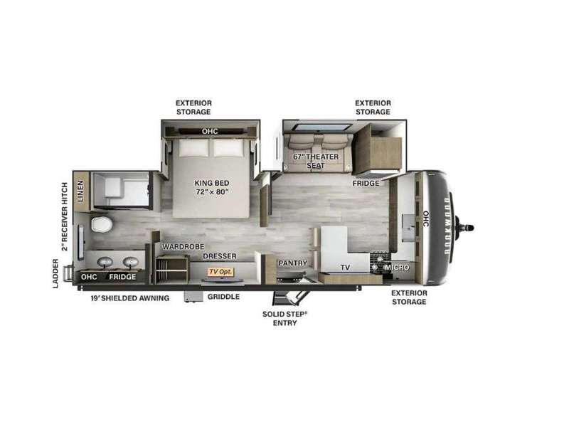 Standard Travel Trailer Package B: White Fiberglass Exterior | Painted Automotive Front Cap with Windshield (Where Available) | Aluminum Cage Construction Including Roof /Floor | Vacuum Laminated Roof | Dexter Torflex Torsion Axles with Aluminum Wheels | Goodyear Endurance Tires with Tire Pressure Monitoring System | Spare Tire/Carrier/Cover | Power Front Jack | Power Stabilizer Jacks | Slam Latch Baggage Doors with Magnetic Holds | Shielded Power Awning with Led Light Strip | Mor-Ryde Strut Assist Steps | Enclosed Underbelly with Thermostatically Controlled Heated Holding Tanks | Black Tank Flush | Quick Recovery Auto Ignite Gas/Elec Water Heater | Azdel Sidewall Exterior Structure | 15K BTU Ducted Roof A/C | 50 Amp Service W/2nd A/C Prep | Air 360+ Omnidirectional Antenna with WIFI prep | Gas Griddle | Rear Ladder | Smart TV | Day/Night Livingroom Roller Shades (Night Shades In Bedroom) | Fireplace (Where Available) | Solid Surface Kitchen Countertops | Soft Close Roller Bearing Drawers | Bluetooth, Ceiling Mounted Speaker | One Control App Control Monitor Panel | Water Saver Shower Miser | Hidden Hinge Cabinet Doors | Frameless Windows | Key Alike Door and Compartment Locks | 200W Solar Panel w/Inverter Installed | Bunkroom 12V Entertainment Smart TV | 2" Accessory Hitch | 12V Refrigerator