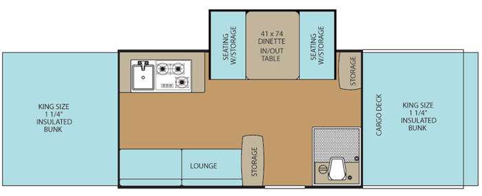 Pack up the kids and bring along a few toys with the added feature of a convenient front cargo storage deck on this V3 V-Trec folding pop-up camper by Viking RV. Once you reach your destination you can unload the deck and fold out the front king size insulated bunk. There is also another king size fold-out tent end bed in the rear as well.